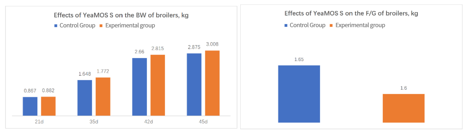About 60000 white feather broilers with 1d and basically the same body weight were randomly divided into 2 treatments and fed commercial broiler diets (Shenyang Dacheng). The broilers in the control group were fed normal water, and the experimental group was fed water with 200g/t of YeaMOS S, the test period was 45 days. The performance of broilers drinking water supplemented with 200g/t YeaMOS S was better than the control group; The whole feed ratio results showed that the feed to meat ratio decreased by 0.05 when drinking water added 200g/t YeaMOS S.