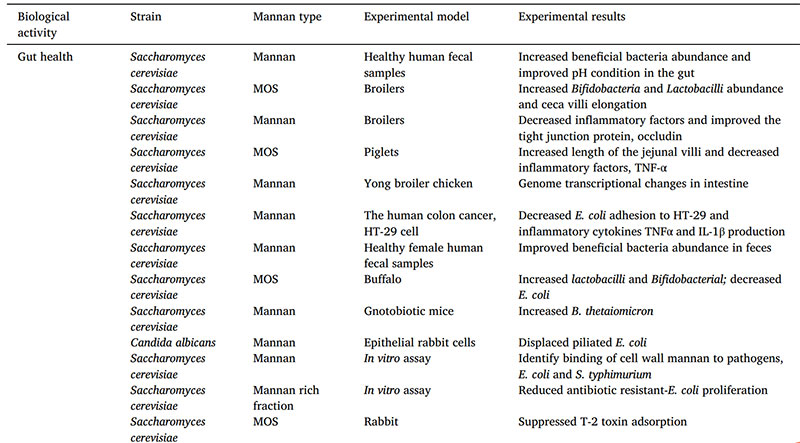Numerous studies have investigated prebiotic effects of mannan in animals and human models summarized as following. For animals, populations of beneficial bacteria, including Bifidobacterium and Lactobacilli, were elevated, and the E.coli population was lower in the ceca of broilers fed MOS, without boiler growth change between the two diets.
