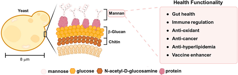 Yeast cell wall consists of β-glucan, mannan, protein, lipid, and chitin, among which β-glucan accounts for about 29% to 64%, and 31% mannan- oligosaccharide, 13% protein, 9% lipid, 1–2% chitin, respectively. Yeast cell wall glucan and mannan have been widely studied and gained commercial interest for their extensive industrial applications. Yeast cell wall components, including mannan, β-glucan, and chitin, have been evaluated for commercial applications. Yeast cell wall glucan and mannan have been widely studied and gained commercial interest for their extensive industrial applications immunology, tissue engineering, vaccines, and drug delivery.