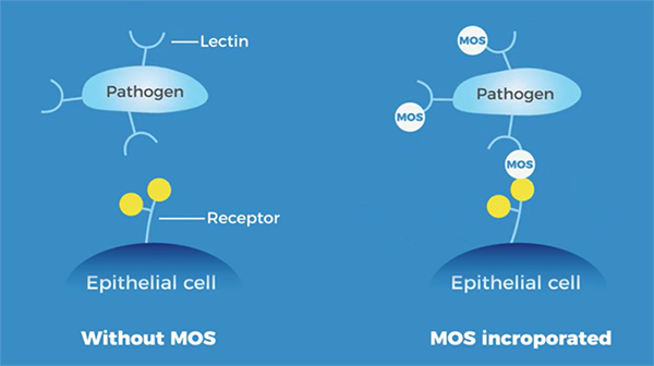 The concentrated yeast mannan-oligosaccharides has similar structure with agglutinate site of pathogens on the intestinal wall. Thus it competitively agglutinate the pathogens and interfere with the agglutinate between pathogens and intestinal wall as the mannan-oligosaccharides cannot be digested by pathogens and intestinal enzymes, the tightly bound pathogen-mannan oligosaccharides complex can be discharged from the body.