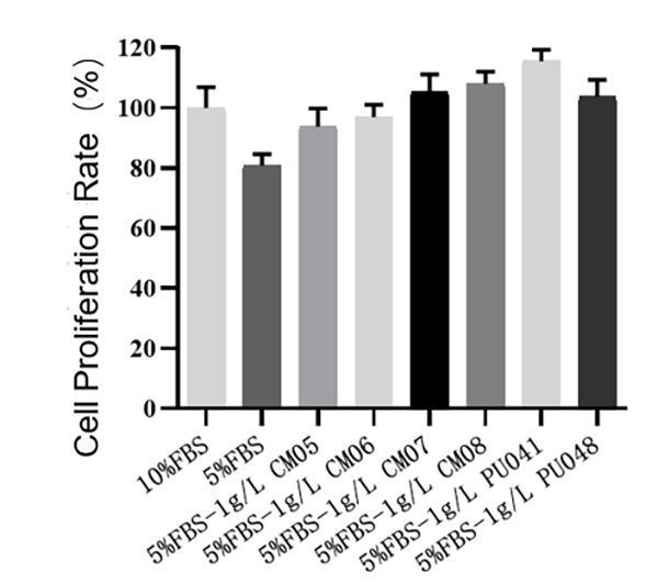 We selected common C2C12 mouse myoblast stem cells as the primary cell line for evaluating stem cell applications. (Figure 1) On the basis of a complete medium with 10% FBS, we added certain concentrations of Angel protein hydrolysates CM05, CM06, CM07, CM08, PU041, and PU048. After 48 hours of culture, CCK8 assays were conducted, and the results showed a certain promoting effect on C2C12 cell proliferation. When serum concentration was reduced to 5% (Figure 2), the experimental groups with Angel protein hydrolysates CM05, CM06, CM07, CM08, PU041, and PU048 still showed a promoting effect on C2C12 cell proliferation, with CM07, CM08, PU041, and PU048 experimental groups even exceeding the proliferation effect of the 10% FBS control group. When serum concentration was further reduced to 2% (Figure 3), under low-serum conditions, the experimental groups with Angel protein hydrolysates CM05, CM06, CM07, CM08, PU041, and PU048 still exhibited significant promoting effects on C2C12 cell proliferation, with the CM07, CM08, and PU041 experimental groups still exceeding the proliferation effect of the 10% FBS control group.