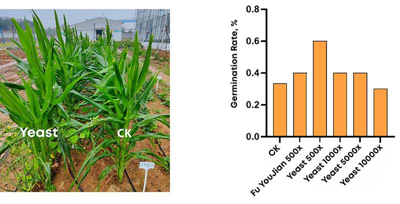 Case 1: During corn sowing, agricultural yeast was diluted 500 times with water for irrigation. The seed germination rate increased by over 20%, and plant height significantly improved.